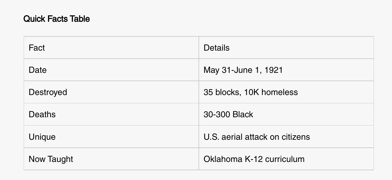 The Tulsa Race Massacre destroyed America's richest Black neighborhood in just 18 hours. Over 35 blocks of Greenwood, known as "Black Wall Street", burned to the ground.1Why was this 1921 event missing from history books for 100 years? This K-12-friendly guide shares the facts, myths, and why it matters today.